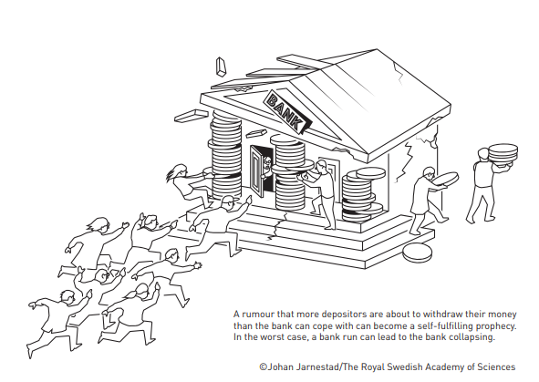 For the economy to function, savings must be channelled to investments. However, there is a conflict here: savers want instant access to their money in case of unexpected outlays, while businesses and homeowners need to know they will not be forced to repay their loans prematurely. In their theory, Diamond and Dybvig show how banks offer an optimal solution to this problem. By acting as intermediaries that accept deposits from many savers, banks can allow depositors to access their money when they wish, while also offering long-term loans to borrowers. However, their analysis also showed how the combination of these two activities makes banks vulnerable to rumours about their imminent collapse. If a large number of savers simultaneously run to the bank to withdraw their money, the rumour may become a self-fulfilling prophecy – a bank run occurs and the bank collapses. These dangerous dynamics can be prevented through the government providing deposit insurance and acting as a lender of last resort to banks. Diamond demonstrated how banks perform another societally important function. As intermediaries between many savers and borrowers, banks are better suited to assessing borrowers’ creditworthiness and ensuring that loans are used for good investments. Ben Bernanke analysed the Great Depression of the 1930s, the worst economic crisis in modern history. Among other things, he showed how bank runs were a decisive factor in the crisis becoming so deep and prolonged. When the banks collapsed, valuable information about borrowers was lost and could not be recreated quickly. Society’s ability to channel savings to productive investments was thus severely diminished.