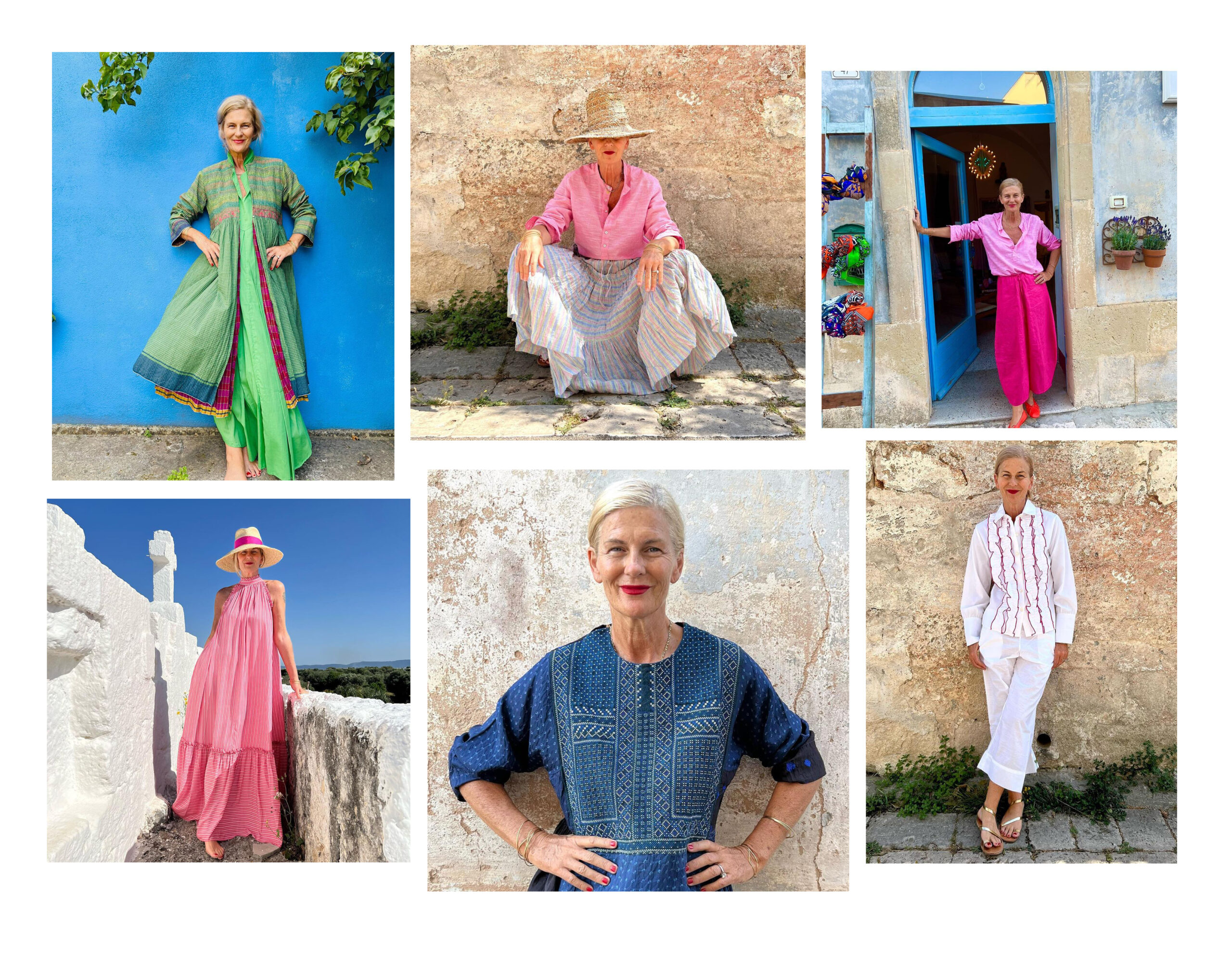 Deborah Nolan has honed fashion sense through running four fashion boutiques in Puglia, Southern Italy. The impeccably dressed, London-born designer shares her bohemian looks daily, to a dedicated following. Exuding confidence and joy in every picture, her outfits are a masterclass in blending colour, proportion and texture. Living in a warmer climate means focusing on easy, unstructured silhouettes in natural fabrics and breezy layers, making her feed the ideal source of sartorial inspiration for a holiday-slash-heatwave wardrobe. Many of the clothes Deborah showcases are from the Tulsi shop, where she sells an eclectic edit of clothing and accessories from craftspeople in Mexico, Africa, India, Vietnam and Thailand featuring natural dyes; handwoven fabrics; homespun textiles; and block prints. This imbues her style with artisanal, adventurous spirit. As a perennially pared-down dresser, I am full of admiration for women who can successfully pull-off this kind of maximalist look.