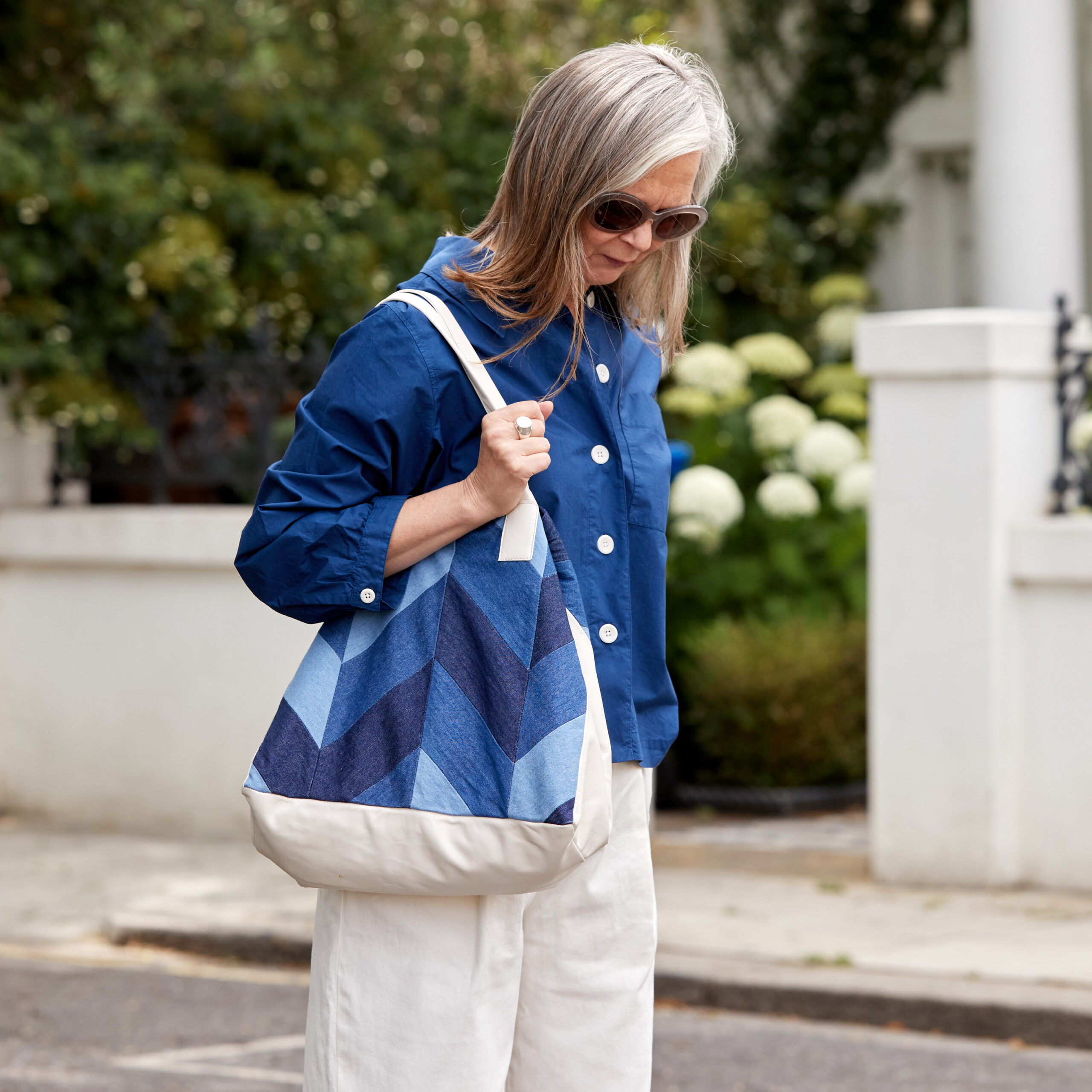 STYLE NOTES: organic cotton poplin shirt loaned from Toast (no longer available in blue. Similar at Cos HERE and Three Graces has a linen version reduced in the sale). The balloon trousers, I bought from Kin at John Lewis (now sold out but always worth keeping an eye on this style as it’s repeated every season). Chunky sandals were a gift from Grenson last year. Chevron patchwork denim and leather bag loaned from independent label Hopeful.